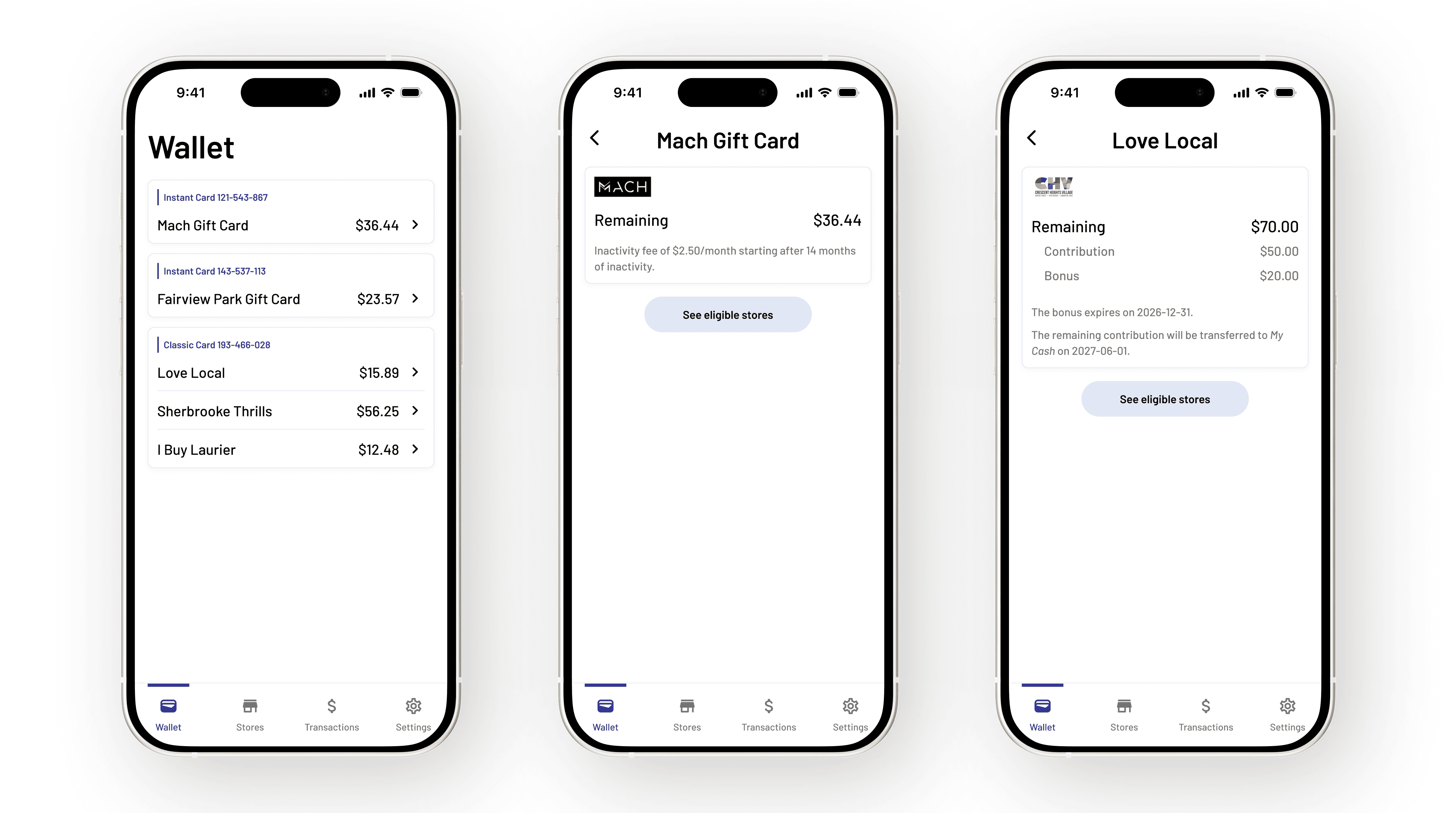 Detailed view of each store showing user's available balance in real time.
