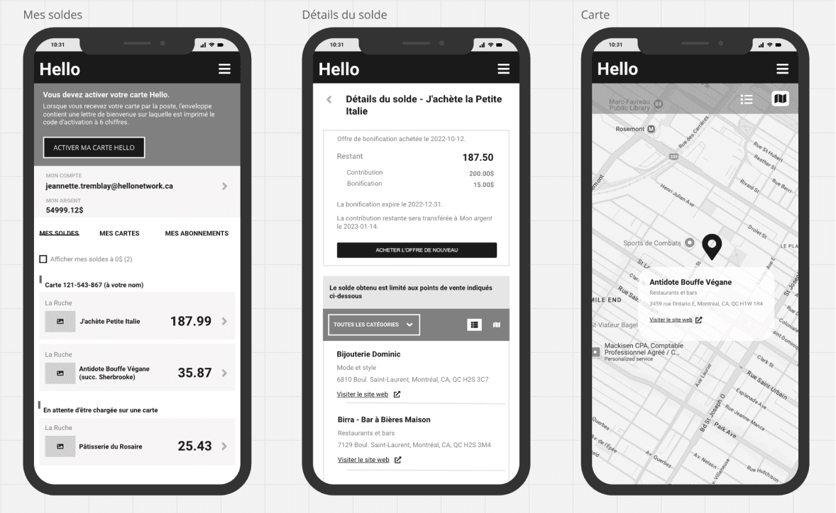 Before finalizing the decision to integrate this feature into the Hello mobile app, I first explored how user balances and participating stores could be displayed in the My Account section of the Hello website, as originally planned. However, as the requirements became more defined and the design grew more complex, it became clear that a mobile app experience would be a better fit.