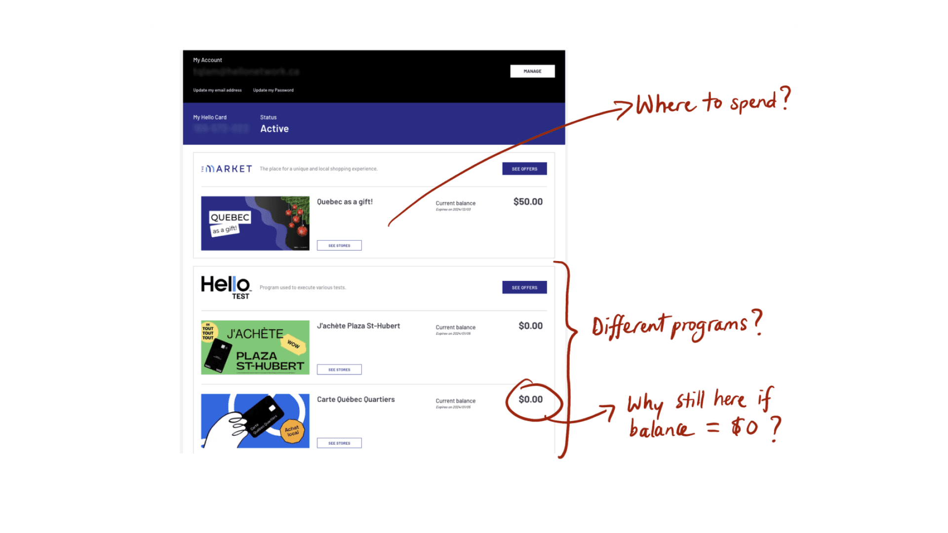 Before finalizing the decision to integrate this feature into the Hello mobile app, I first explored how user balances and participating stores could be displayed in the My Account section of the Hello website, as originally planned. However, as the requirements became more defined and the design grew more complex, it became clear that a mobile app experience would be a better fit.